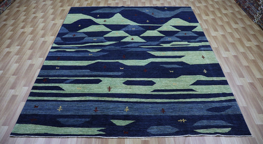 8x10 ft Gabbeh Area Rug, Blue & Green Afghan Hand Knotted Wool Traditional Rectangle Carpet, Rugs For Living Room, Bedroom Rug, Animal Rug