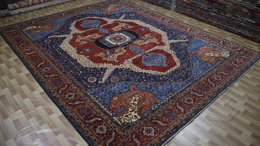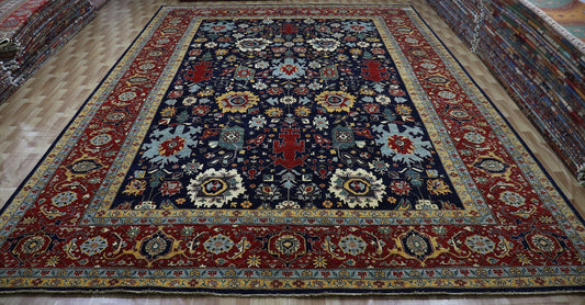 12x15 Ft Heriz Large Area Rug, Blue Red Persian Style Hand Knotted Wool Medallion Carpet, Rug For Living Room, Bedroom Rug, Dining Table Rug