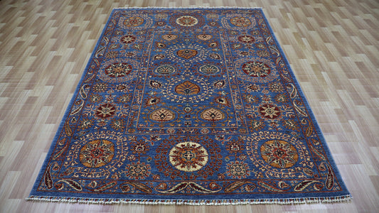 6x8 ft Blue Floral Area Rug, Afghan Hand Knotted Wool Traditional Rectangle Area Carpet, Rugs For Living Room, Bedroom Rug, Dining Table Rug