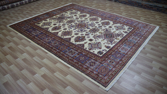 8x10 Ft Oriental Kazak Area Rug, Beige Afghan Hand Knotted Wool Traditional Rectangle Carpet, Living Room Rug, Bedroom Rug, Dining Table Rug