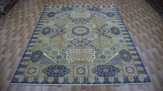 8x10 Ft Oriental Mamluk Area Rug, Blue Afghan Hand Knotted Wool Traditional Rectangle Carpet, Living Room Rug, Bedroom Rug, Dining Table Rug