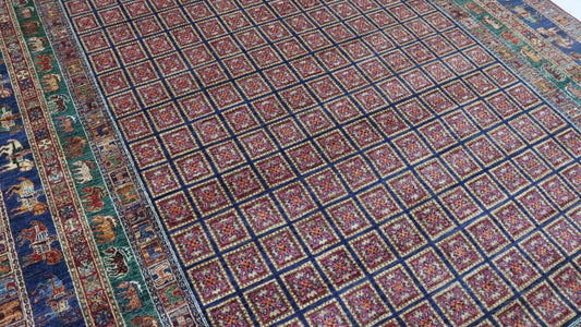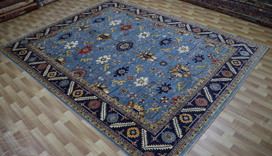 9x12 Ft Oriental Area Rug, Blue Afghan Hand Knotted Wool Traditional Carpet, Rugs For Living Room, Bedroom Rug, Dining Table Rug, Floral Rug