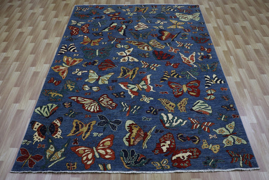 6x9 ft Butterfly Gabbeh Area Rug, Blue Afghan Hand Knotted Wool Tribal Rectangle Carpet, Rugs For Living Room, Bedroom Rug, Dining Table Rug