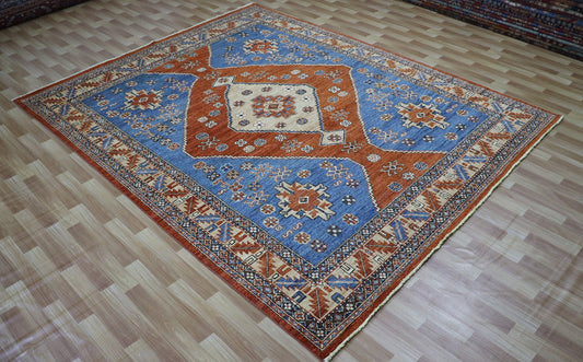 8x10 Ft Tribal Area Rug, Blue/Rust Red Afghan Hand Knotted Wool Traditional Carpet, Rugs For Living Room, Bedroom Rug, Dining Table Rug