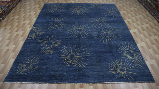 9x11 ft Abstract Gabbeh Area Rug, Blue Afghan Hand Knotted Wool Transitional Rectangle Rug, Living Room Rug, Bedroom Rug, Dining Table Rug