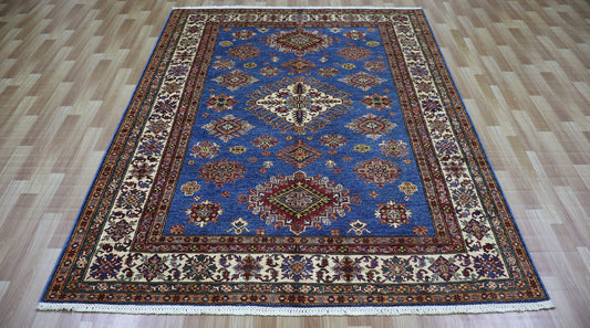 6x8 ft Kazak Area Rug, Blue Geometric Afghan Hand Knotted Wool Traditional Rectangle Carpet, Rugs For Living Room, Bedroom Rug, Dining Table