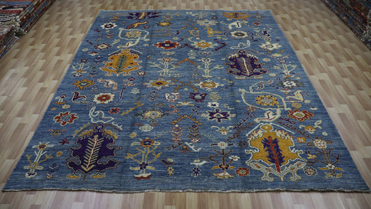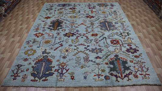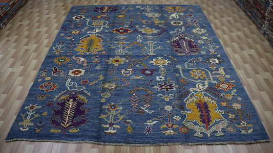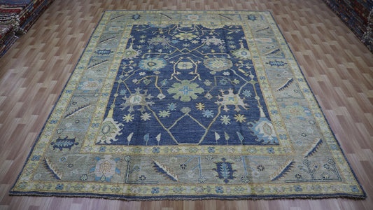 9x11 Ft Blue Oushak Large Area Rug, Afghan Hand Knotted Plush Wool Traditional Rectangle Carpet, Living Room Rug, Bedroom Rug, Floral Rug