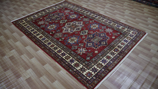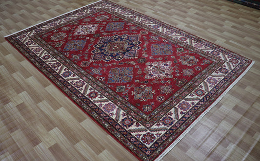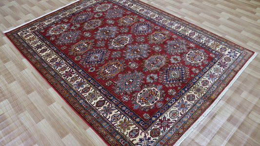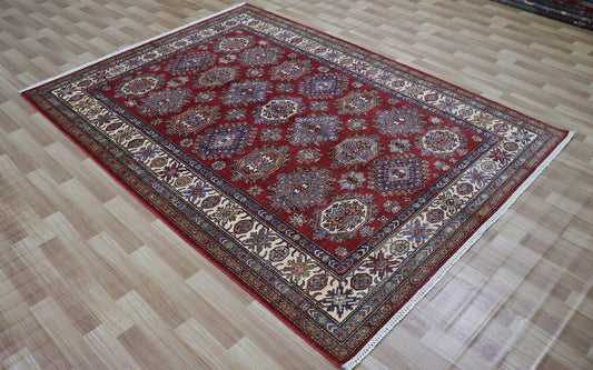 6x8 Ft Oriental Kazak Area Rug, Red Afghan Hand Knotted Wool Traditional Rectangle Carpet, Living Room Rug, Bedroom Rug, Dining Table Rug