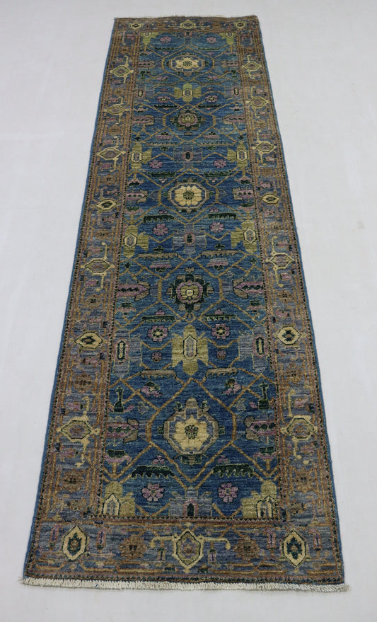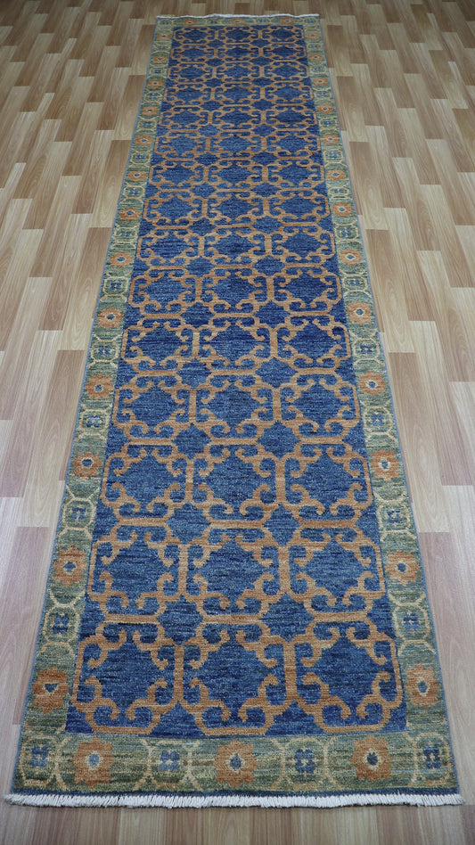10 Ft Oriental Runner Rug, Blue Afghan Hand Knotted Wool Traditional Rectangle Carpet, Entryway Rug, Hallway Rug, Kitchen Rug, Foyer Rug