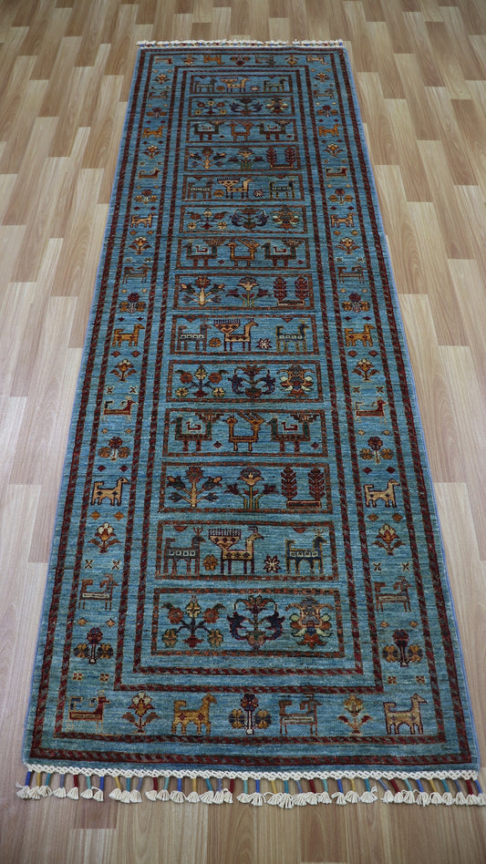 8 Ft Animal Print Runner Rug, Blue Afghan Hand Knotted Wool Traditional Rectangle Carpet, Entryway Rug, Hallway Rug, Kitchen Rug, Foyer Rug