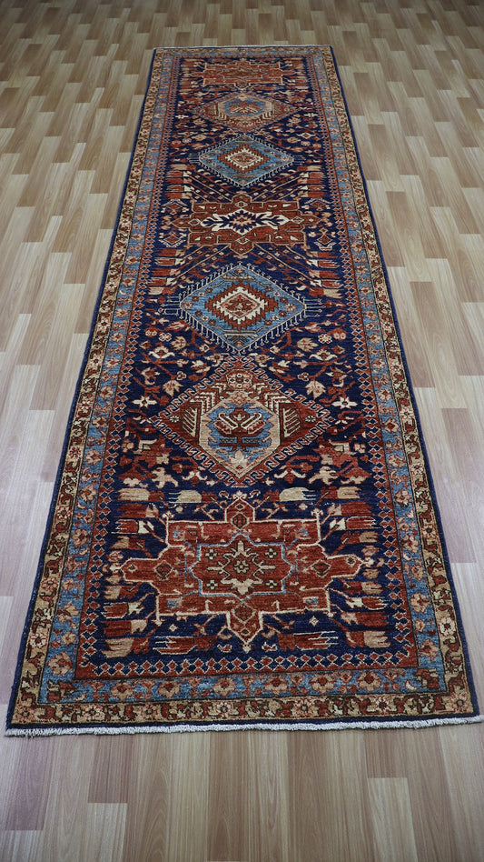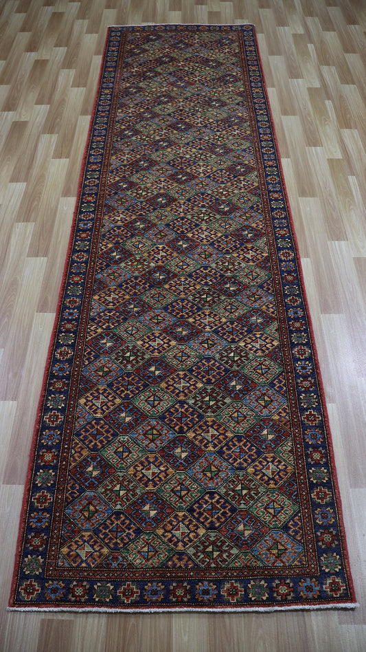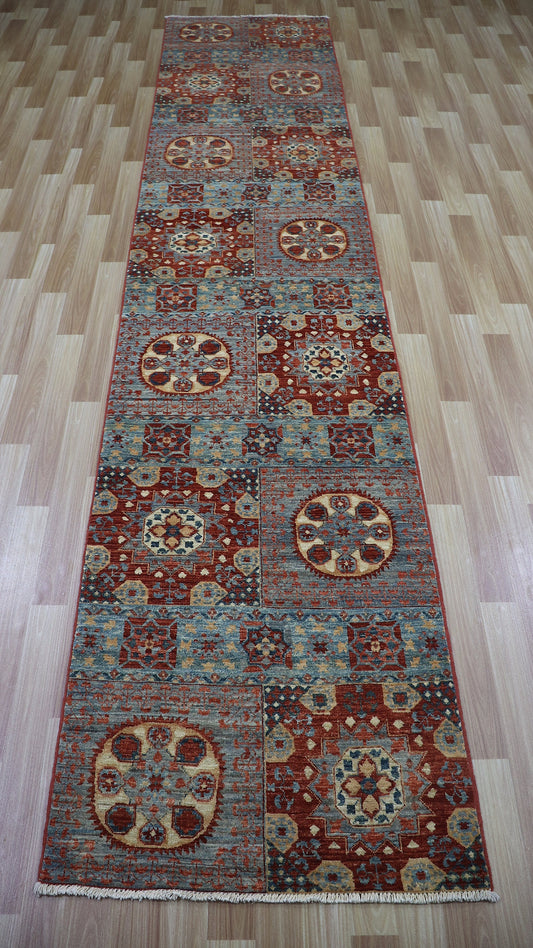 10 Ft Oriental Runner Rug, Red Blue Afghan Hand Knotted Wool Traditional Rectangle Carpet, Entryway Rug, Hallway Rug, Kitchen Rug, Foyer Rug