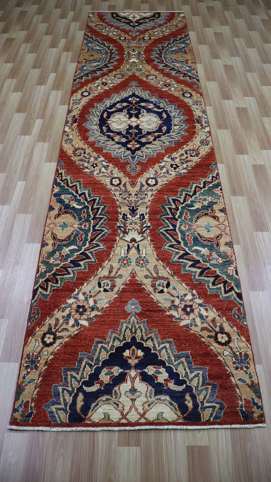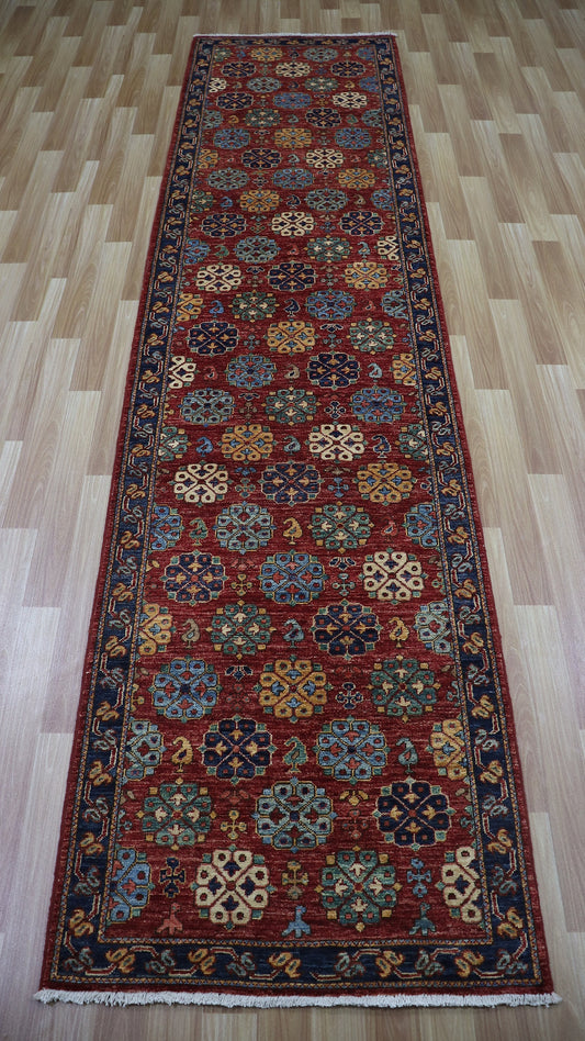 10 Ft Floral Runner Rug, Red Blue Afghan Hand Knotted Wool Traditional Rectangle Carpet, Entryway Rug, Hallway Rug, Kitchen Rug, Foyer Rug