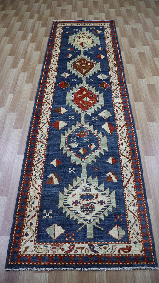 9 Ft Oriental Blue Afghan Hand Knotted Wool Runner Rug