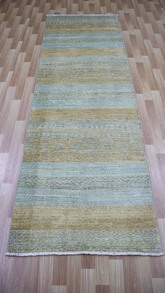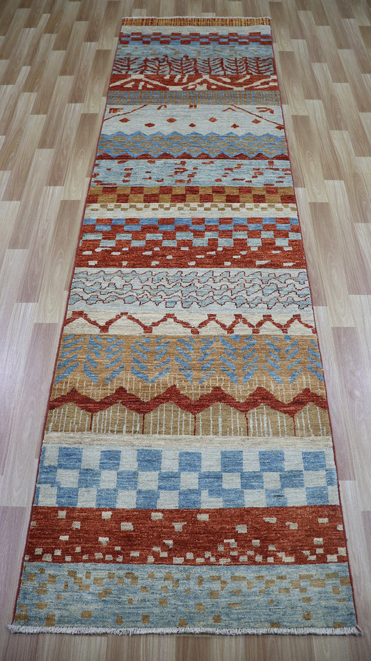 10 Ft Striped Runner Rug, Blue Afghan Hand Knotted Wool Transitional Rectangle Carpet, Entryway Rug, Hallway Rug, Kitchen Rug, Foyer Rug