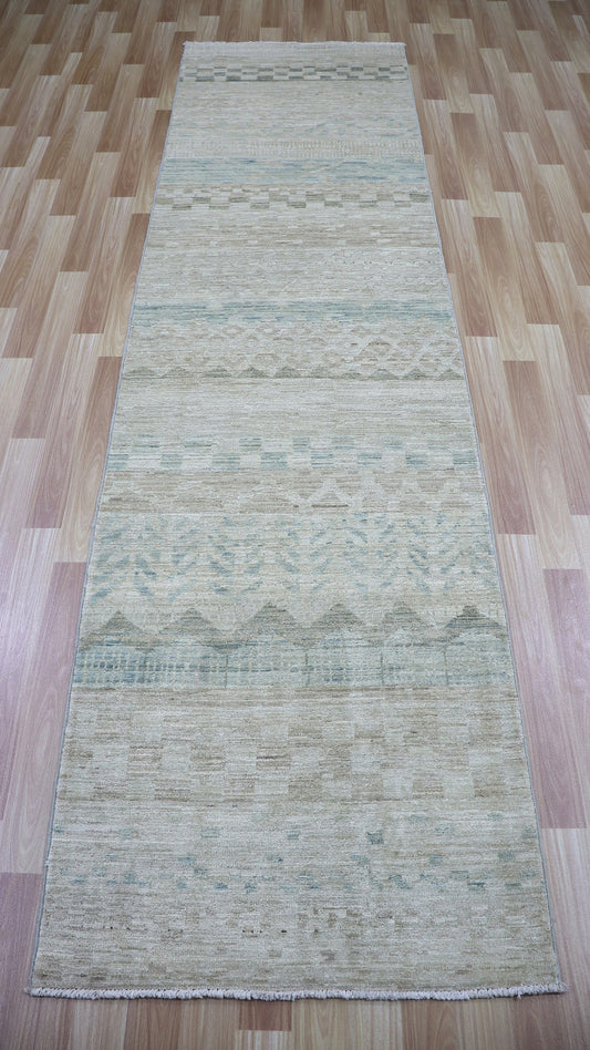 10 Ft Transitional Runner Rug, Beige Afghan Hand Knotted Wool Abstract Rectangle Carpet, Entryway Rug, Hallway Rug, Kitchen Rug, Foyer Rug