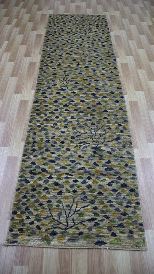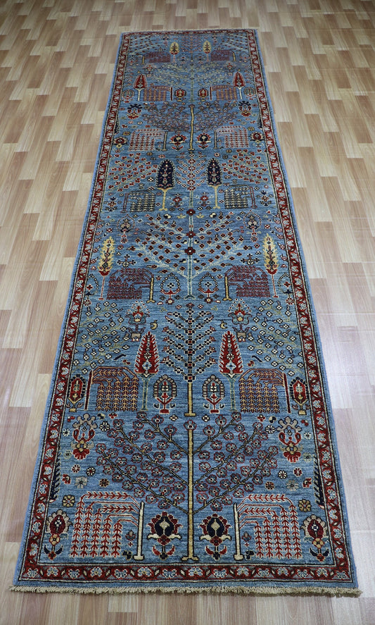 12 ft Tree Tribal Long Runner Rug, Blue Afghan Hand Knotted Wool Traditional Carpet, Rugs For Hallway, Entryway Rug, Foyer Rug, Kitchen Rug