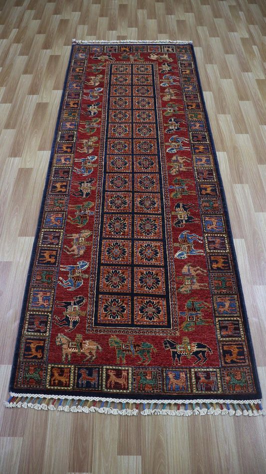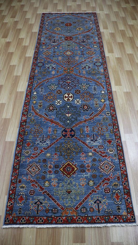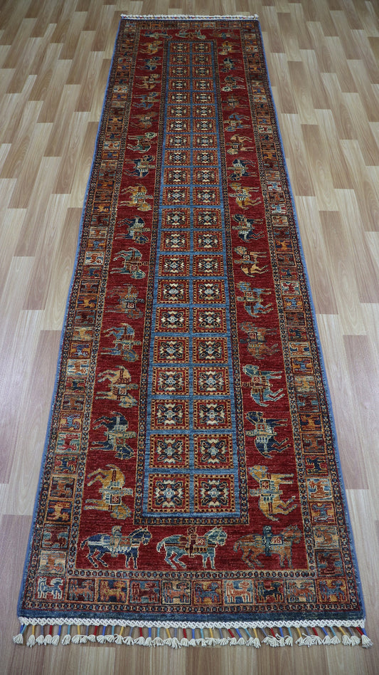 10 Ft Pazyryk Runner Rug, Red Blue Afghan Hand Knotted Wool Traditional Rectangle Carpet, Entryway Rug, Hallway Rug, Kitchen Rug, Foyer Rug