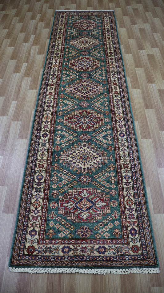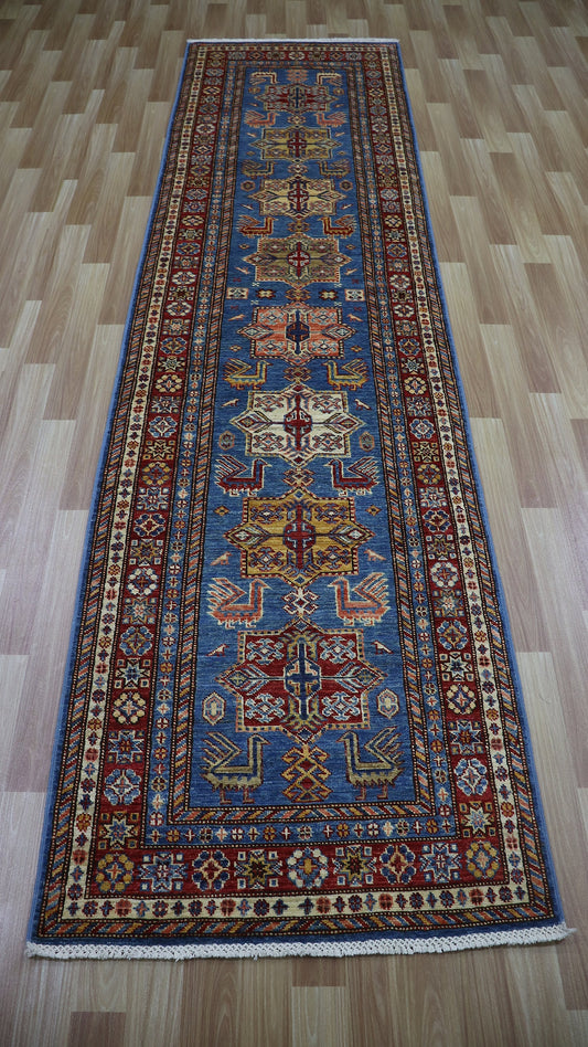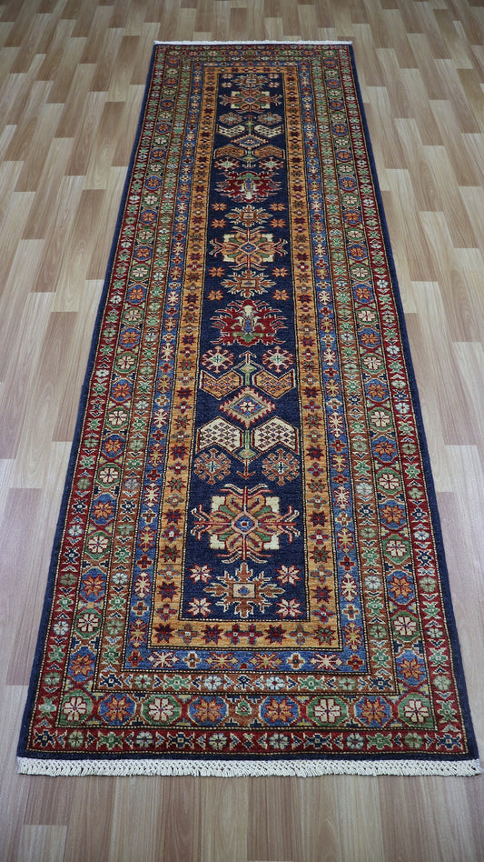 10 Ft Oriental Kazak Runner Rug, Afghan Hand Knotted Wool Traditional Rectangle Carpet, Entryway Rug, Hallway Rug, Kitchen Rug, Foyer Rug