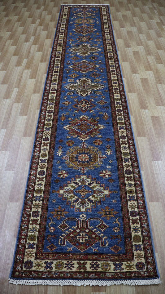 13 Ft Kazak Oriental Long Runner Rug, Blue Afghan Hand Knotted Wool Traditional Carpet, Entryway Rug, Hallway Rug, Kitchen Rug, Stair Rug