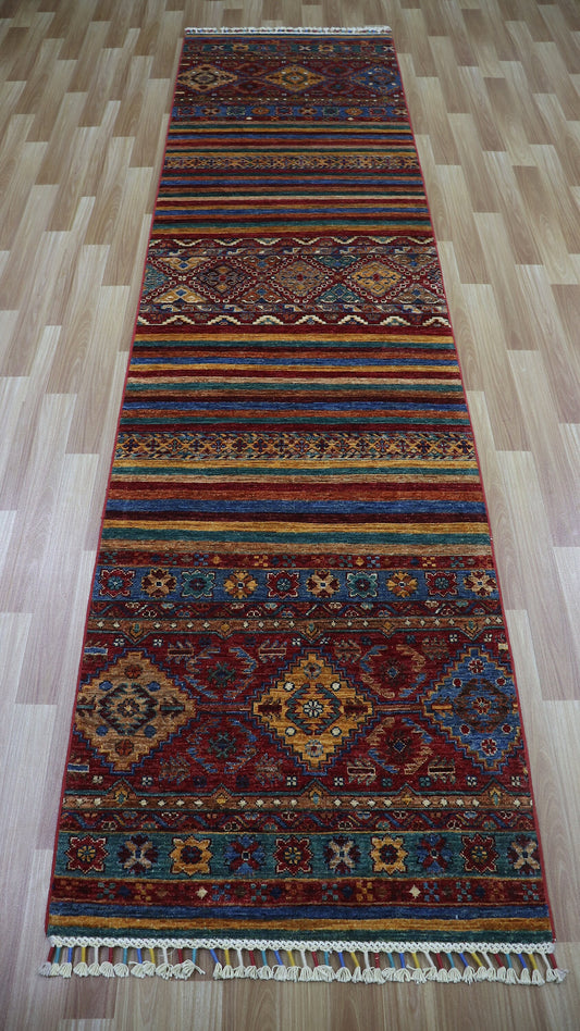 10 Ft Gabbeh Runner Rug, Multicolor Afghan Hand Knotted Wool Traditional Rectangle Carpet, Entryway Rug, Hallway Rug, Kitchen Rug, Foyer Rug