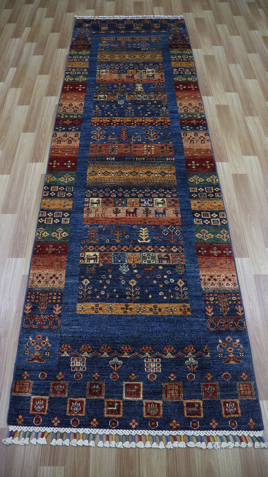 9 Ft Tribal Gabbeh Runner Rug, Blue Afghan Hand Knotted Wool Traditional Rectangle Carpet, Entryway Rug, Hallway Rug, Kitchen Rug, Foyer Rug