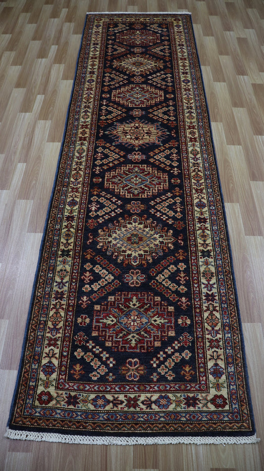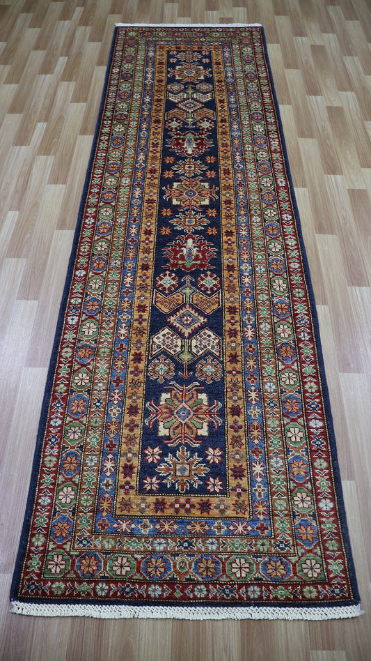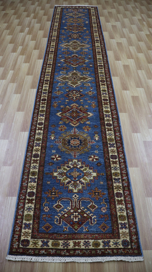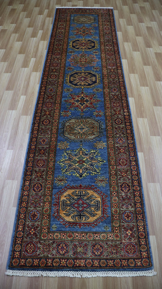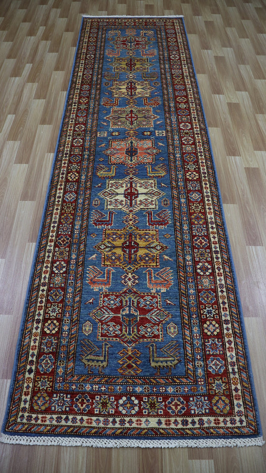 11 Ft Oriental Kazak Runner Rug, Blue Afghan Hand Knotted Wool Traditional Rectangle Carpet, Entryway Rug, Hallway Rug, Kitchen & Foyer Rug