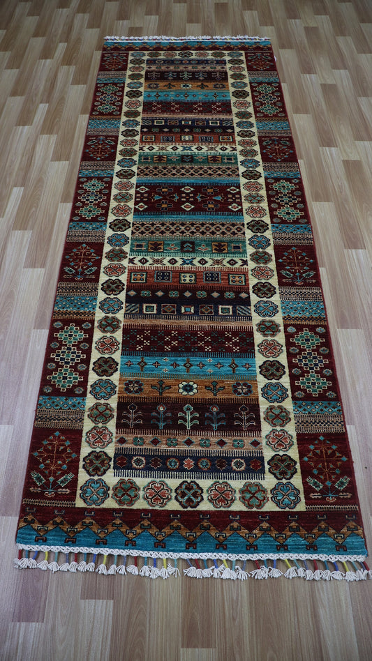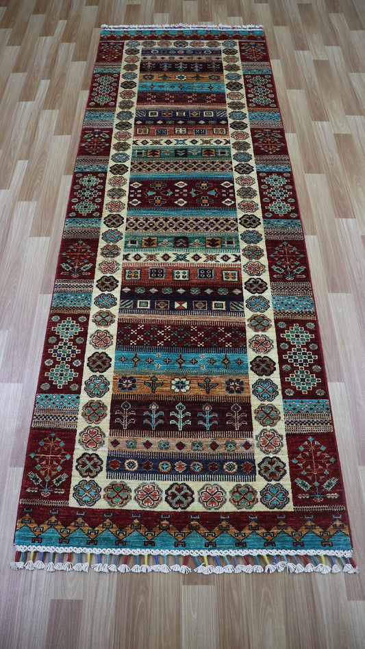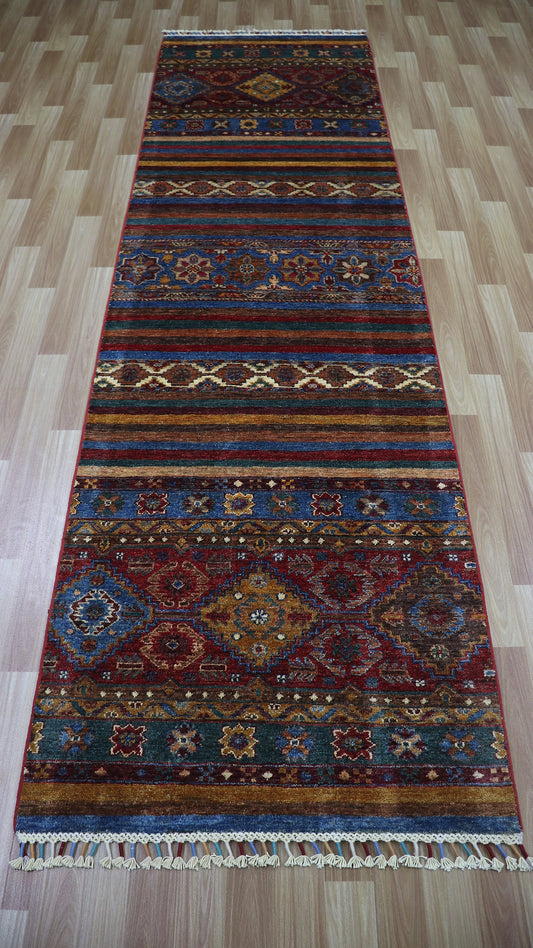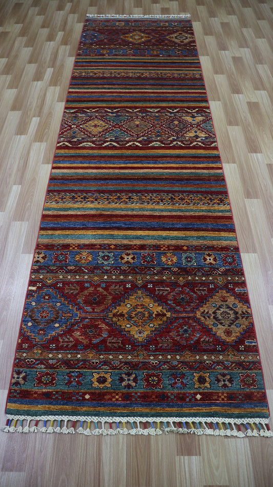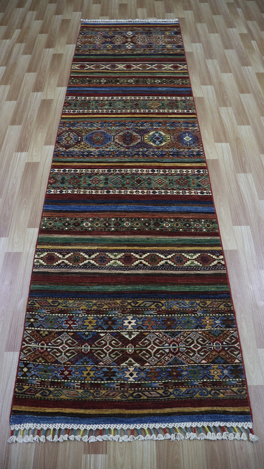 10 Ft Oriental Runner Rug, Afghan Hand Knotted Wool Striped Rectangle Carpet, Entryway Rug, Hallway Rug, Kitchen Rug, Foyer Rug, Stair Rug