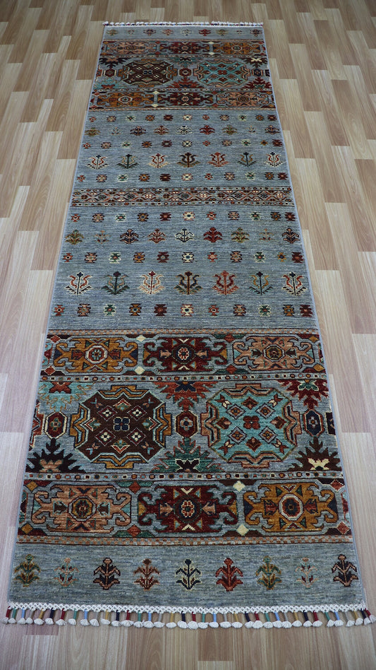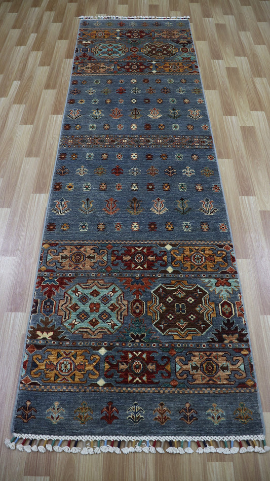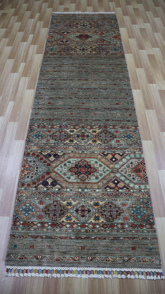 9 Ft Gray Tribal Khorjin Runner Rug, Afghan Hand Knotted Wool Traditional Rectangle Carpet, Entryway Rug, Hallway Rug, Kitchen Rug,Foyer Rug