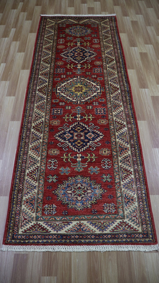8 Ft Oriental Kazak Runner Rug, Red Afghan Hand Knotted Wool Traditional Rectangle Carpet, Entryway Rug, Hallway Rug, Kitchen Rug, Foyer Rug