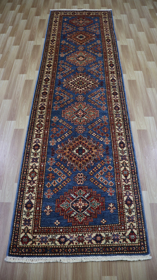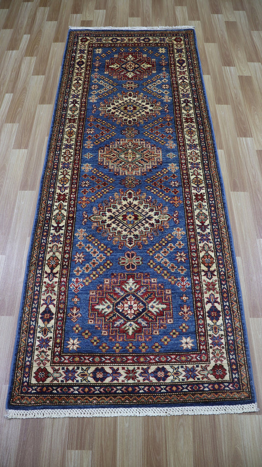 9 Ft Kazak Runner Rug, Blue Beige Afghan Hand Knotted Wool Traditional Rectangle Carpet, Entryway Rug, Hallway Rug, Kitchen Rug, Foyer Rug