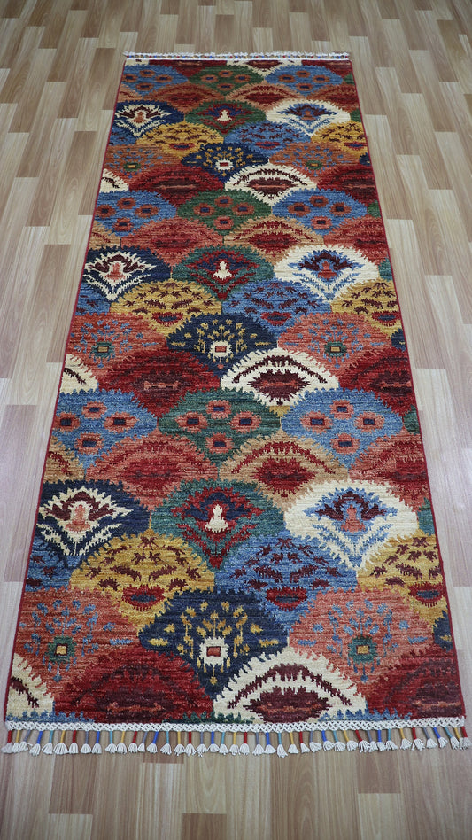 8 Ft Oriental Ikat Runner Rug, Red Afghan Hand Knotted Wool Traditional Rectangle Carpet, Entryway Rug, Hallway Rug, Kitchen Rug, Foyer Rug