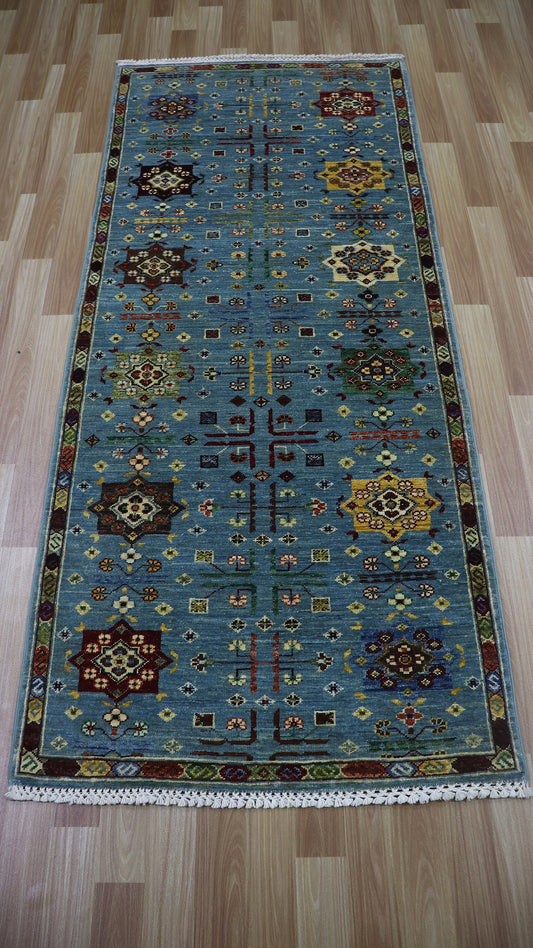 10 Ft Runner Rug, Blue Oriental Afghan Hand Knotted Wool Traditional Rectangle Carpet, Entryway Rug, Hallway Rug, Kitchen Rug, Foyer Rug