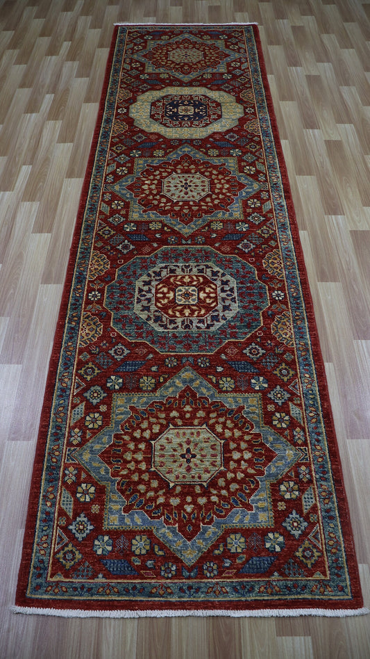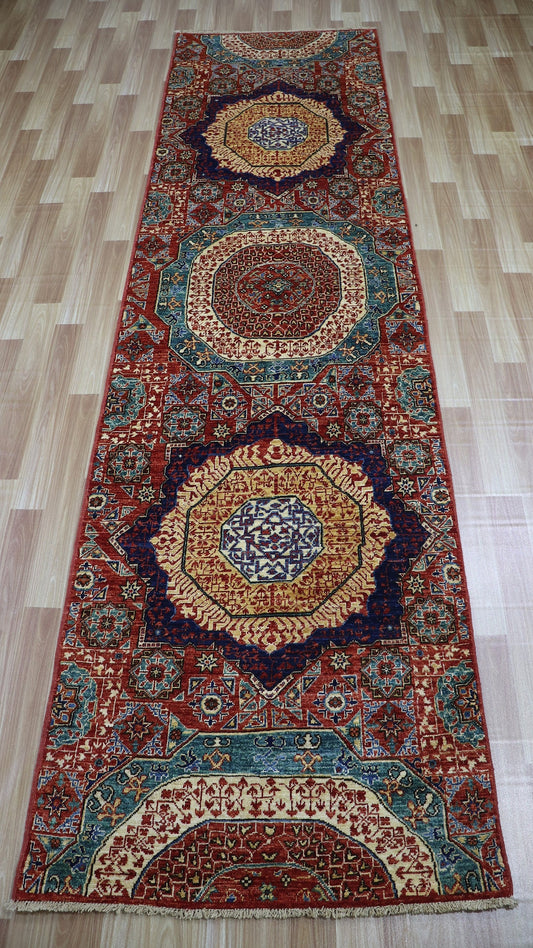 10 Ft Turkish Mamluk Runner Rug, Red Afghan Hand Knotted Wool Traditional Carpet, Rugs For Entryway, Hallway Rug, Kitchen Rug, Medallion Rug