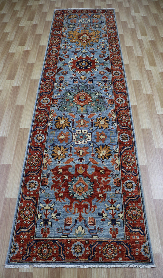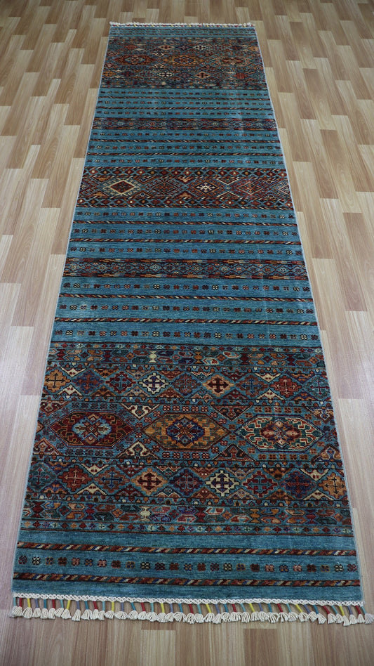 10 Ft Tribal Runner Rug, Blue Afghan Hand Knotted Wool Traditional Rectangle Carpet, Entryway Rug, Hallway Rug, Kitchen Rug, Foyer Rug