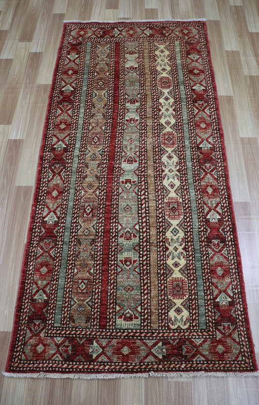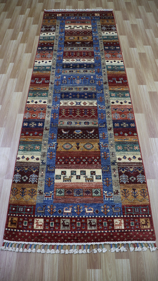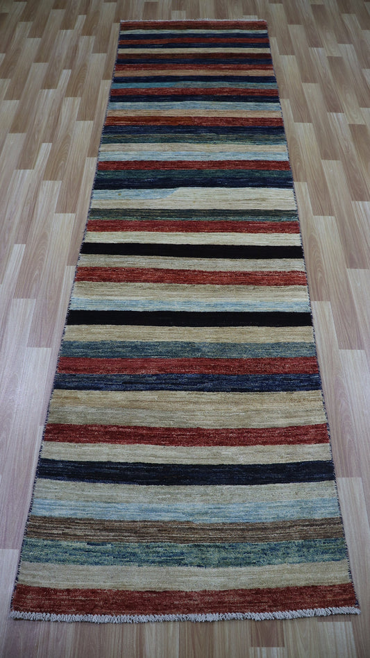 9 Ft Striped Runner Rug, Colorful Afghan Hand Knotted Wool Traditional Rectangle Carpet, Entryway Rug, Hallway Rug, Kitchen Rug, Foyer Rug