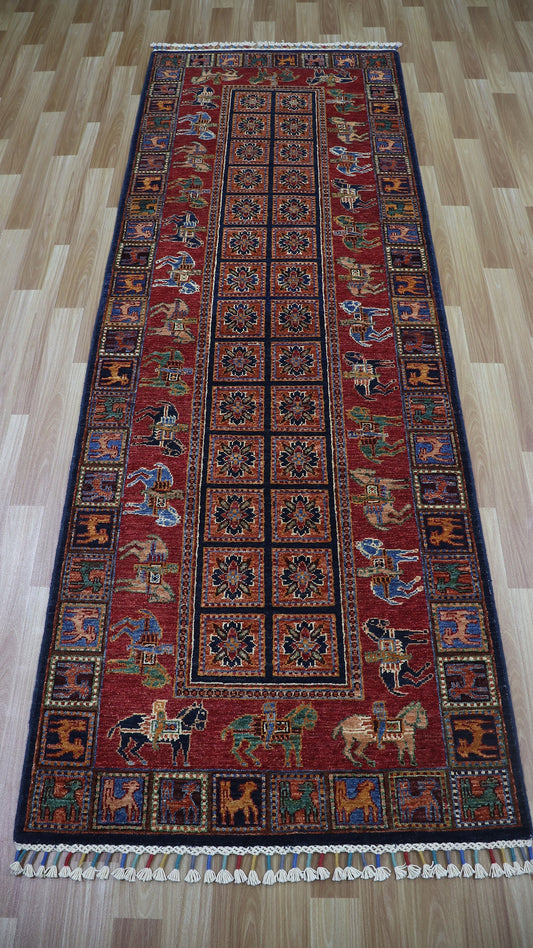 9 Ft Animal Design Runner Rug, Red Afghan Hand Knotted Wool Traditional Rectangle Carpet, Entryway Rug, Hallway Rug, Kitchen Rug, Foyer Rug