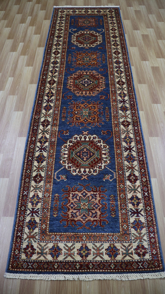 10 Ft Oriental Runner Rug, Blue Afghan Hand Knotted Wool Traditional Rectangle Carpet, Entryway Rug, Hallway Rug, Kitchen Rug, Foyer Rug
