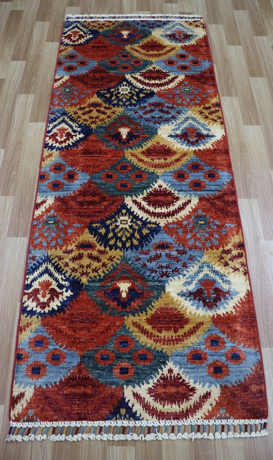 7 Ft Red Ikat Runner Rug, Afghan Hand Knotted Wool Traditional Rectangle Carpet, Entryway Rug, Hallway Rug, Kitchen Rug, Living Room Rug