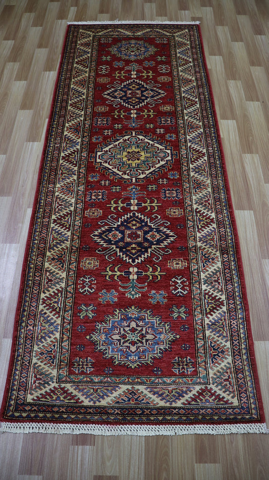 8 Ft Oriental Kazak Runner Rug, Red Afghan Hand Knotted Wool Traditional Rectangle Carpet, Entryway Rug, Hallway Rug, Kitchen Rug, Foyer Rug