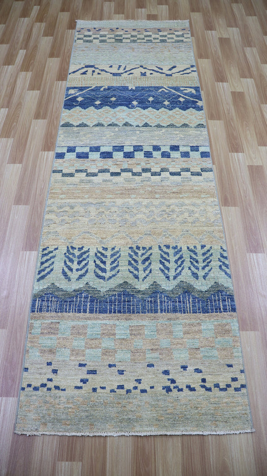 9 Ft Striped Runner Rug, Beige Blue Afghan Hand Knotted Wool Traditional Rectangle Carpet, Entryway Rug, Hallway Rug, Kitchen Rug, Foyer Rug