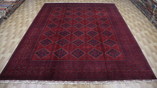 10x12 Ft Oriental Bokhara Area Rug, Red Afghan Hand Knotted Wool Traditional Rectangle Carpet, Living Room Rug, Bedroom Rug, Kids Room Rug