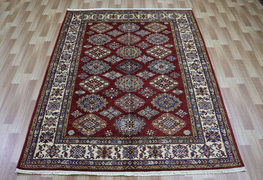 5x7 ft Kazak Oriental Area Rug, Red Afghan Hand Knotted Wool Traditional Carpet, Living Room Rug, Bedroom Rug, Dining Table Rug, Kitchen Rug